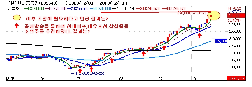 하이닉스와 더불어 공개적으로 추천한 중공업관련 주식이다. 붉은 화살표는 강력 언급했던 위치이다. 이후 빨간동그라미 안에 노란색을로 표시된 위치에서 중공업주식은 조정에 들어간다라고 언급하였다. 현재도 조정은 진행 중이다.