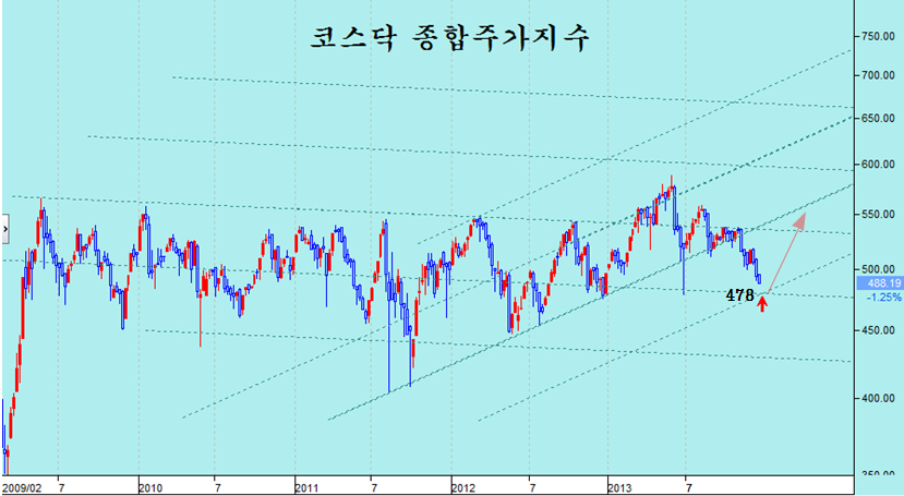 종합주가지수는 0.09%의 약보합에 머물렀지만, 연말과 관련한 매물이 나오는 코스닥은 6.17포인트 , 1,27%가 하락하여 하락을 이어갔다. 11월 이후 하락이 이어진 코스닥 지수는 연말 매물의 영향을 강하게 받으며 하락이 이어지고 있으나 핵심 추세 구도로는 478을 지지로 상승으로 전환될 것으로 보인다.
