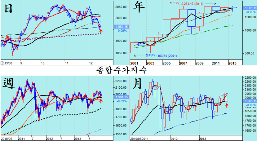 글로벌 펀드의 연말 펀드 결산이 있고 보면 이 저항이 연내에 돌파되기는 어려워 보이지만, 지지선과 저항선의 쐐기형 수렴이 마무리 국면이고, 세계 경기가 제조업을 중심으로 2011년 상반기 수준으로 회복이 강화되고 있다는 점에서 이 저항의 돌파 후에는 대단히 강한 상승 국면이 기대된다.