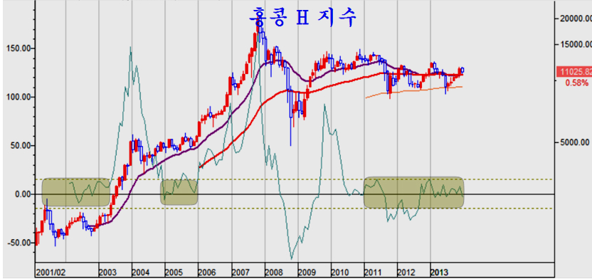 또한 이머징 국가의 대표인 인도 봄베이 증시나 중국 상해 증시 지수 역시 이 모습처럼 대세 저항의 돌파를 앞두고 있다. 이런 점에서 이 저항이 돌파될 때는 이머징 국가 증시가 동반 강세 현상이 나타나기 쉽다.