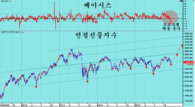 연결선물 지수는 중요한 핵심도의 지지권에 접해 있어 단기적으로 상승이 기대되는 곳이다. 특히 10월 이후 베이시스가 마이너스로 하락하는 과정에서 프로그램 차익 매도가 증가하며 프로그램 관련 매물을 줄이고 있다는 점에서 상승이 가벼운 조건을 만들고 있다.