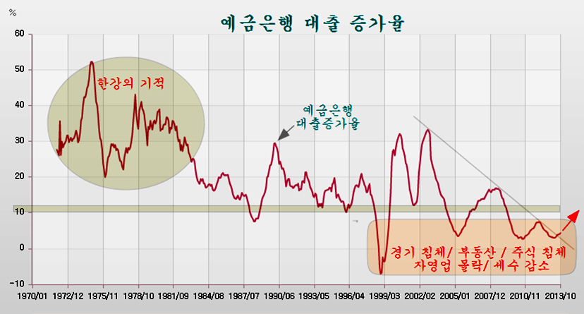 1970년 이후의 은행대출 증가율의 장기 추이를 보면 2003년 이전에는 외환위기를 제외하고는 증가율이 10% 이하로 내려선 적이 드물었다. 한강의 기적이라 일컫는 1970년대의 고속 성장도 연 30%데 달하는 높은 은행의 자금 공급이 가능했기 때문이다.