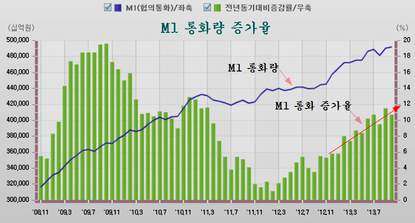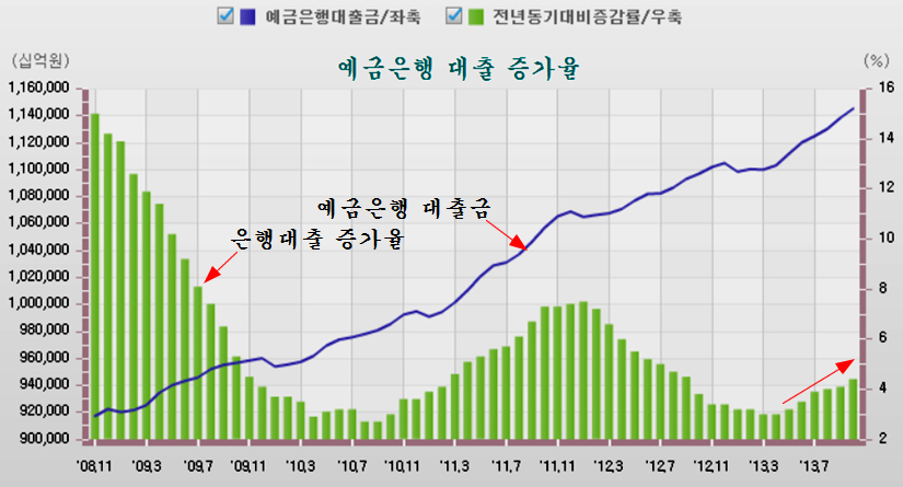 2013년 하반기 한국은행의 통화 공급 증가에 따라 본원통화와 M1 통화량의 공급이 충분함에도 여전히 돈 가뭄 현상이 해갈되지 않은 것은, 이 돈을 회전시키는 은행의 대출이 원활하지 않기 때문이다. 통화 공급이 증가했던 2013년 하반기 은행대출 증가율은 4% 미만에 머물러 돈이 도는 것을 막고 있는 상황이다.