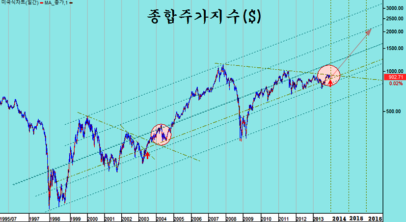 외국인에 의해 선물과 현물 모두 철저히 통제와 관리가 되고 있는 종합주가지수는 달러를 기준해서 보면 2007년과 2011년의 고점을 잇는 대세 저항의 돌파를 앞두고 있다. 지난 9월 상승이 이 저항선에 막히면서 조정을 받고 있으나 이 저항 돌파가 임박한 상태이다.