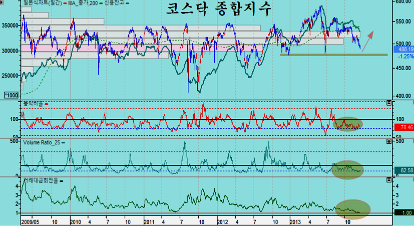 지난해 중반 이후 대형주에 비해 상대적으로 강세를 이어왔던 코스닥 지수는 올 상반기 과도한 신용잔고 증가와 함께 조정으로 전환되었고 이후 7개월여에 걸친 장기 조정이 이어지고 있다. 등락비율이나 볼륨레이쇼로 보아 이례적으로 기간이 길다. 이런 장기 조정 과정은 매물을 충분히 소화해 주게 되므로 이후 강한 상승을 준비하게 된다. 거래대금 회전율이 이례적으로 1.00수준까지 하락한 이런 모습에서 매물이 충분히 감소한 것을 보여준다.