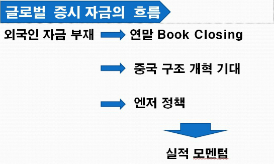 내년 2014년도에 한국이 외국인의 관심을 끌 수 있는 유일한 비책은 실적 모멘텀이다. 과거 증권사의 실적 리포트를 보면 연초의 실적전망이 연말 실적 확정이 있어서 그 갭이 19%정도 하향된 적이 있고 기대에 못 미치는 기업들의 실적발표는 외국인의 관심을 끌기에 역부족으로 보인다. 하지만 각종 지표들은 견조한 회복세를 보이고 있으며 부의 효과(통화정책으로 인한 부동산과 주식가격 상승)와 지난해 부진했던 업황에 대한 기저효과로 소비의 개선을 기대하며, 위에서 언급했듯이 내년 글로벌 경기의 회복세가 국내 수출 기업들의 실적을 견인해 준다면 국내 경기의 회복세가 가시화되면서 외국인의 관심을 국내를 돌릴 수 있지 않을까 생각한다. 따라서 지금은 실적이 받쳐 주는 종목군들에 관심을 가질 필요가 있으며 특히 기관들 중 연기금의 수급이 두드러지는 만큼 연기금이 매수하는 종목에도 관심을 기울여 볼 만 하다.