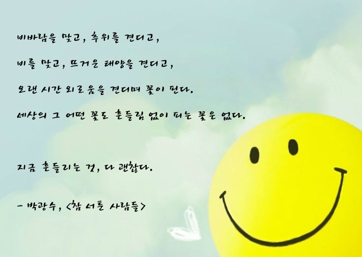 지금 흔들리는 것, 다 괜찮습니다. 흔들림 없이 피는 꽃이 없는 것처럼 주식시장도 흔들림 없이 지속적인 수익만을 주지 않습니다. 그 단순한 원리만 이해한다면 아주 편안한 마음으로 투자에 임하실 수 있을 것입니다. 시장이 어려워 이러지도 저러지도 못하고 혼자 고민하시는 분들은 18(화) ~ 19(수) 내일과 모레 이틀간 허니스탁에서 무료방송을 진행하니 참여하셔서 고민을 해결해 보시기 바랍니다.