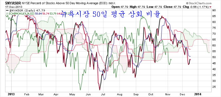 실제 시장의 흐름을 나타내는 지표로 50일 평균을 넘는 종목의 비율이 있다. 이 지표를 보면 10월 중순부터 조정을 시작한 뉴욕 시장은 현재 충분한 조정과 함께 상승을 준비하고 있다. 따라서 파생상품과 전략적인 목적으로 등락하는 지수와 관계없이 뉴욕시장은 조정을 마무리하고 상승을 준비하는 국면이라 할 수 있다.