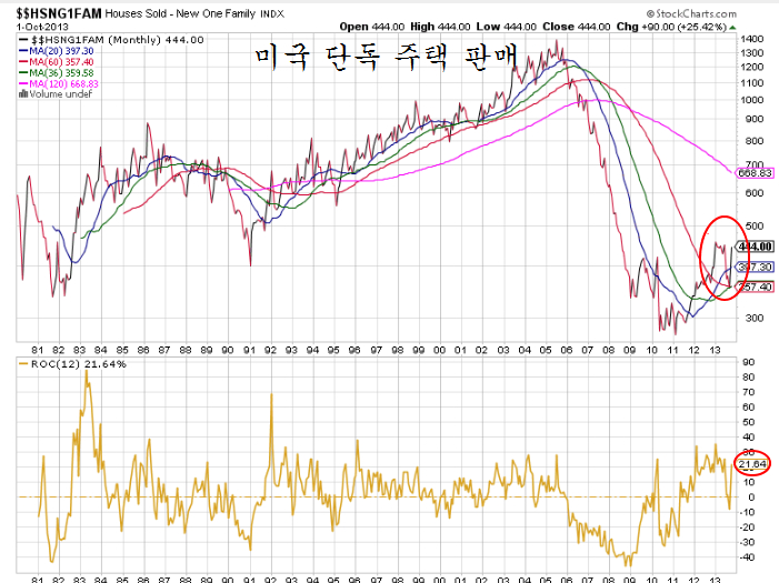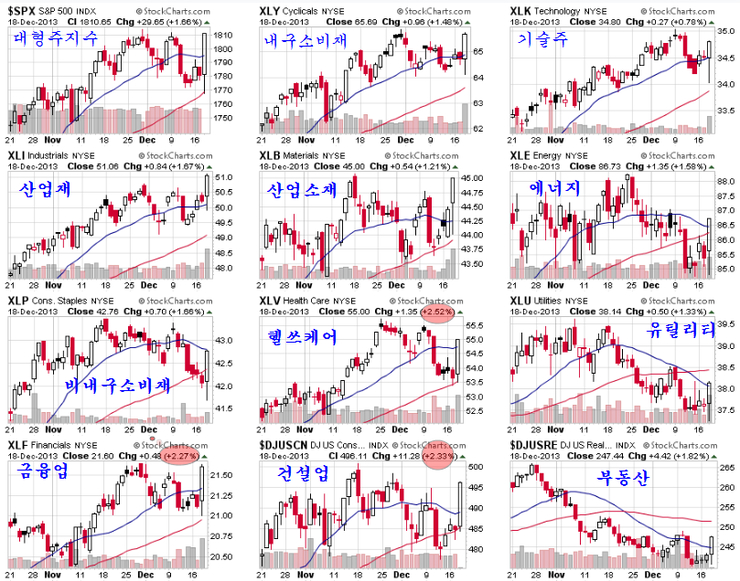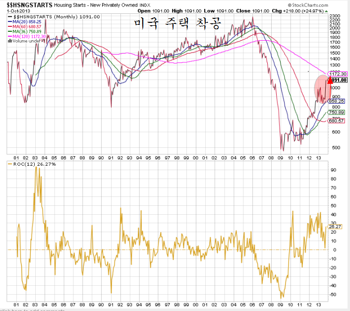 이렇게 건설과 금융 및 산업과 산업소재가 오른데는 경기 모멘텀이 작용하고 있다. 미국이 건설업은 2011년 하반기를 저점으로 2013년 1분기까지 꾸준한 성장이 이어졌으나, 2013년 2분기 이후 수축된 채 머물렀고 특히 정부의 셧다운으로 주택관련 통계가 수개월 통계 발표가 지연되어왔다