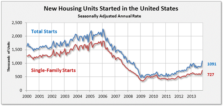 어제 발표된 주택착공은 두분기 정체했던 주택착공이 20%가 넘는 급증으로 나타나며, 연율 100만채를 넘어서 두분기의 수축에도 불구하고 2011년 이후의 증가 추세를 유지하는 급상승 추세가 이어지고 있음을 나타낸다. 이것은 그간 건설업이 둔화된다거나 예상보다 덜 성장한다는 전망을 돌변시키는 변화로 향후 건설과 연관된 모든 부문에 드라마틱한 예상 변화를 줄 수 있는 요소이다.