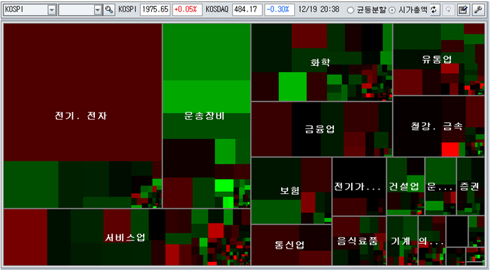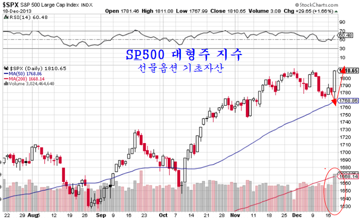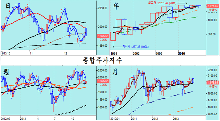 미국 시장이 강한 상승 마감을 하면서 종합주가지수가 20일 평균에서 출발했으나, 개인의 콜옵션에 대한 무리한 베팅과 외국인의 지수 압박이 나타나 결국 강보합권에서 마감하는 장세가 되었다. 종합주가지수는 결제기준 2013년 거래일을 4일 남긴 채 60주 평균의 바닥권에 머물고 있는 모습이다.