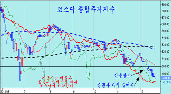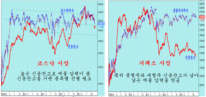 코스닥 시장과 거래소 시장의 가장 중요한 차이는 신용잔고이다. 2010년 ~ 2011년 1분기 구간에서는 거래소 대형주 신용잔고가 늘어난 반면, 코스닥과 소형주 신용잔고가 감소했기 때문에 2011년 연말 이후 코스닥과 소형주 중심의 상승이 나타나고 대형주가 조정을 받은 반면, 지금은 소형주 신용 잔고가 아직도 크게 남아 잇는 반면 거래소 중형주와 대형주의 신용이 줄어 있다.