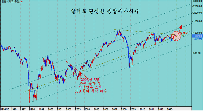 달러로 환산한 종합주가지수는 쐐기형 수렴이 마무리 국면에 있으며 이 저항을 돌파하는 경우 외국인의 주식 매수와 함께 강한 상승이 나타나게 된다. 그 시점은 옵션 시장에서의 게임이 결정하게 되기 쉽다.