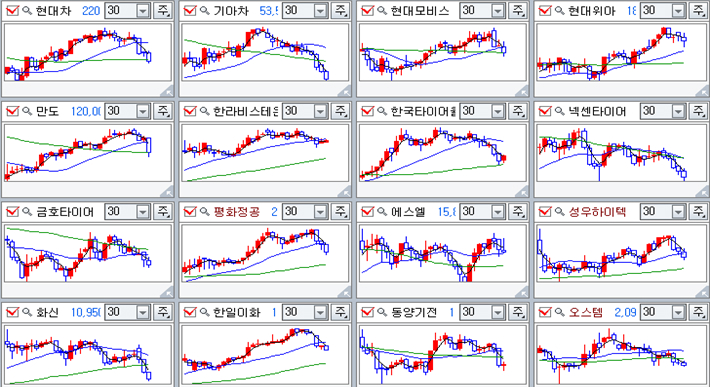 오늘 지수를 압박하기 위한 업종은 자동차였다. 삼성전자를 비롯한 금융과 퉁신 철강 유통업이 강보합권을 나타냈지만 자동차 업종이 큰 폭 하락하며 지수 하락의 원인이 되었다.