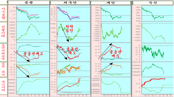 외국인은 초반 상승을 유인하던 전략을 바꾸어 곧바로 콜옵션 매도와 동반하여 선물 매도로 지수를 하방으로 압박하여 상승을 제한하였으나 주식 시장에서는 순매수 행진이 이어졌다.