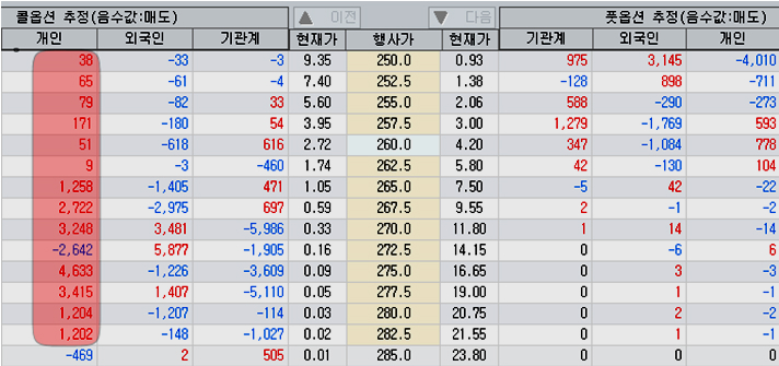 개인은 미국 상승에 고무된 듯, 행사가격을 돌파하면 한 계약당 1억 3000만원의 현물 주식 거래에 상응하는 콜옵션을 대거 사들였고, 이에 대응하여 외국인은 자동차 업종을 두들기며 지수를 압박하였다.