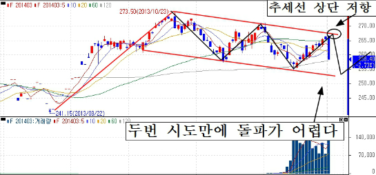 선물차트를 보면....연말 코스피지수 상승으로 상승깃대형의 추세선 상단에 위치해있음을 볼 수 있는데 2번째 고점에서 추세선 상단을 돌파하기는 기술적으로 어렵다.