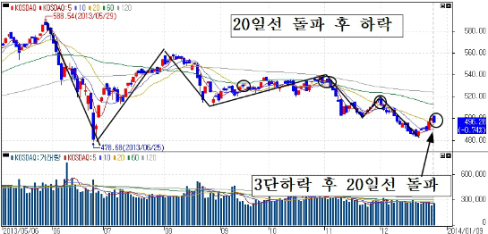 그동안 코스닥지수는 20일선을 돌파하고 재하락이 발생한바 있고 지금도 20일선 돌파후 음봉이 나왔다. 분명 부담이 될 수 밖에 없지만 보통 3단 하락후 20일선을 상향돌파 하게 되면 추세전환이 나오는 경우가 많기 때문에 최근 3단 하락이 나왔다는 점은 주목해야 한다.