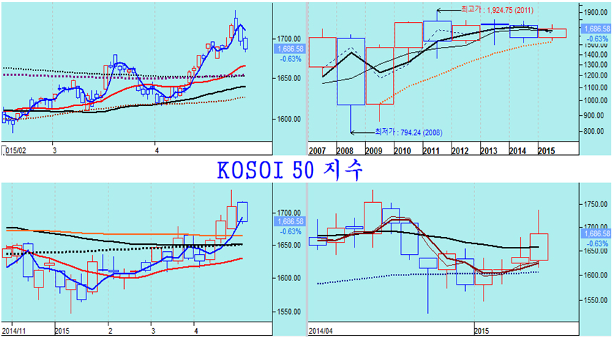삼성전자자나 현대차에 대해 실적 우려를 부풀리고 있으나 현재의 조정은 옵션 게임의 일환일 뿐 실적과 무관하며, 실적발표와도 별 상관이 없는 흐름이다. 도박지수인 KOSPI 50을 보면 지난주 지수를 이끄는 자동차를 상승시켜 옵션 프리미엄을 확대한 다음 하락으로 유인하는 수익 전략이 이어지고 있고, 옵션 포재션을 볼 때 KOSPI 50 지수를 기준하여 1650까지도 하여 1650을 전후한 가격까지 변동을 거칠 가능성이 있다.