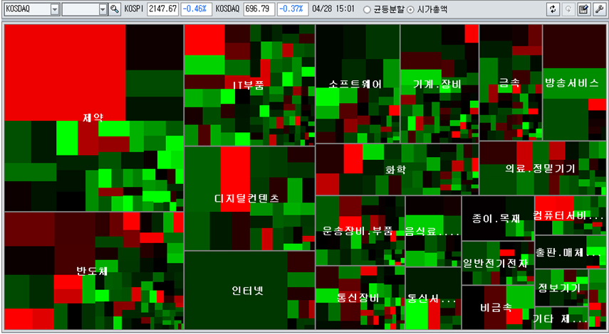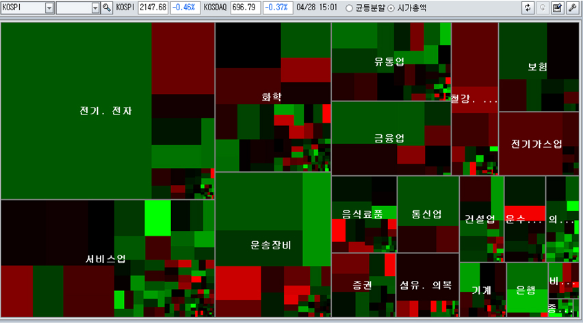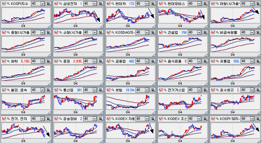 업종별 흐름을 보면 삼성전자와 현대차, 현대모비스, 신한지주 같은 시가총액이 큰 대형주들이 하락하면서 KOSPI 50 지수를 하락시켜 종합지수 하락으로 나타나고 있으나, 그간 상승에서 소외된 철강과 통신, 전기가스, 조선, 해운 업이 상승을 하고, 그간 상승을 해 온 화학과 증권 음식료 유통 등도 상승을 쉬어가는 숨고르기 국면이 이어지고 있다. 그러나 이런 변동과 관계없이 장기 상승 추세가 이어지고 있어 만기를 전후한 조정이야 말로 저가 매수할 수 있는 기회이다.