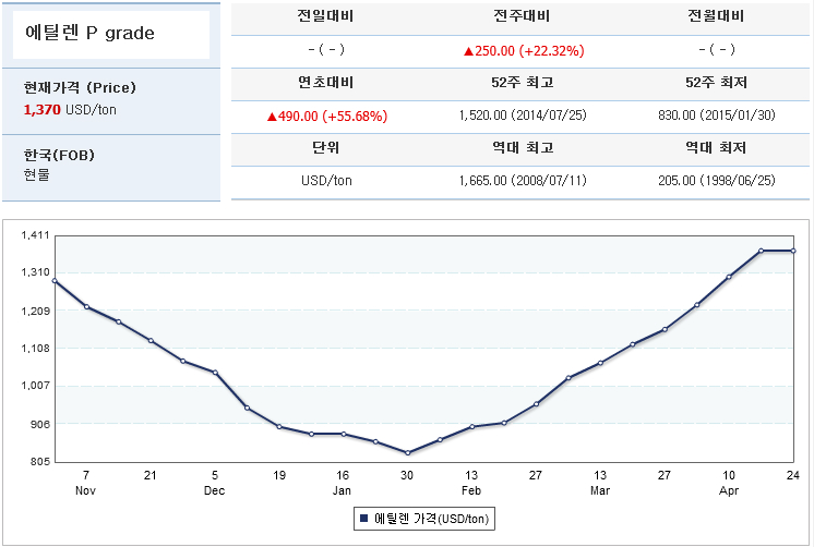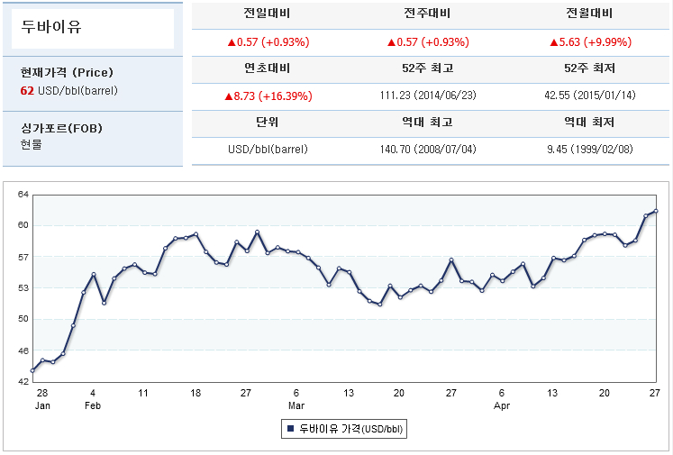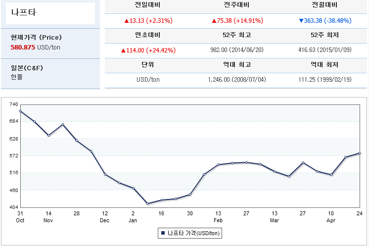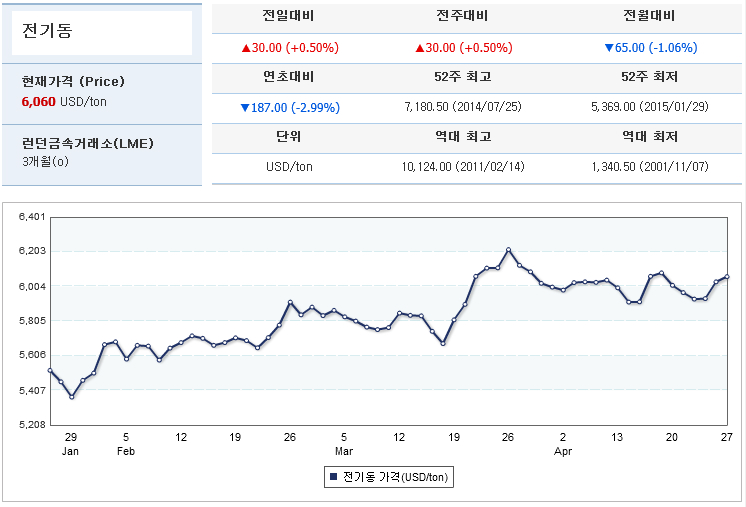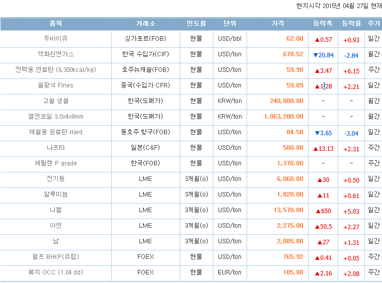 다음은 4월 24일과 4월 27일의 산업통상자원부가 관리하는 주요 원자재 가격이다.
