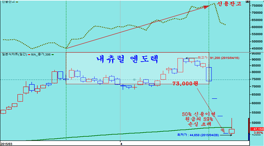 3월 중순 이후 신용잔고가 가파르게 증가했고 대부분 73,000원 이상에서 증가한 신용잔고라는 점에서 보면, 83,000원 수준에서 평가액의 50%를 신용으로 더 산 경우 남는 금액은 1/3 이 되지 않고, 100% 신용을 쓴 경우라면 7%가 남아 원금 대부분이 손실이다. 73,000원 수준에서 평가액 50%을 신용으로 샀다고 해도 남는 것은 40% 남짓이다.