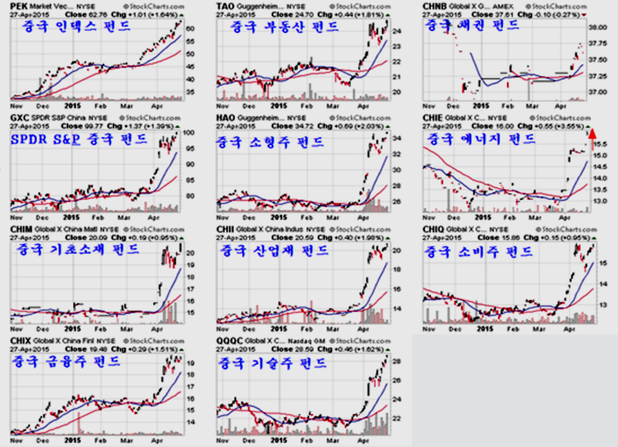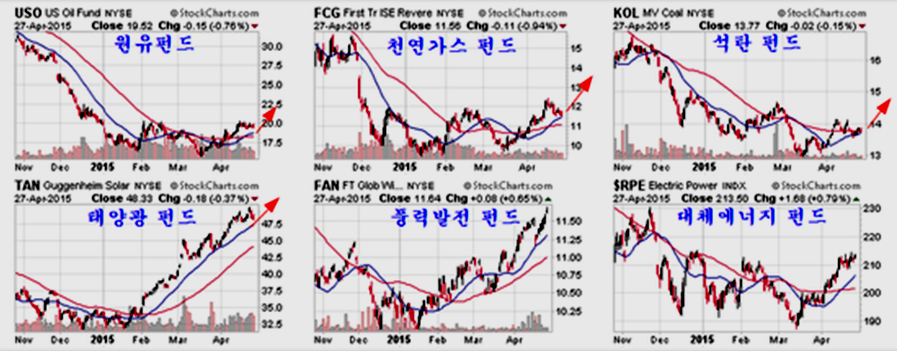 이런 중국의 경기 회복 기대에 맞물려 우선 원유를 포함한 에너지 가격 상승을 기대하고, 뉴욕시장에서 에너지 펀드가 강세이다. 원유펀드 USO, 천연가스 펀드 FCG, 석탄펀드 KOL과 대체에너지인 태양광 펀드 TAN, 풍력발전 펀드 FAN, 대체에너지 펀드 GEX가 모두 바닥권에서 상승을 시작하는 모습으로 단기 변동에 관계없이 장기 상승 추세로 발전하는 중이다.