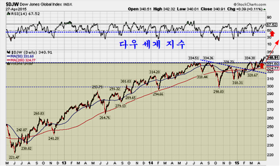 그러나 시장이 강하게 오르고 중국을 필두로 주변국 증시가 오르는 강세 국면과 함께 다우 세계 지수의 상승세가 계속되고 있다.
