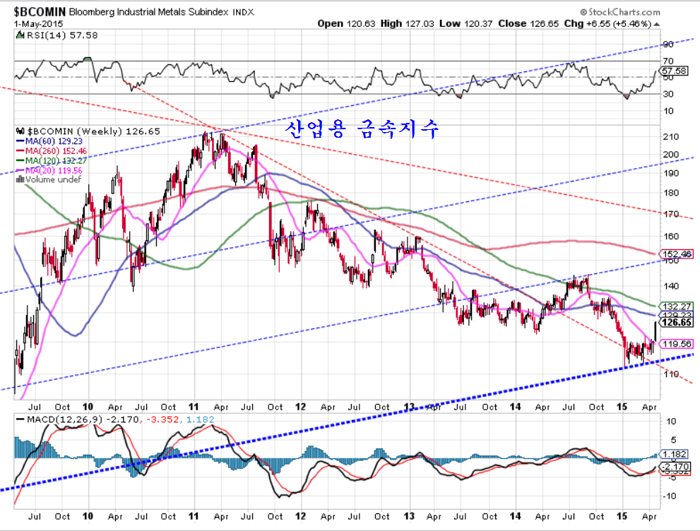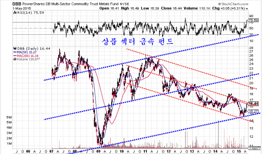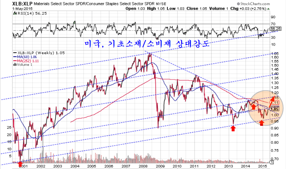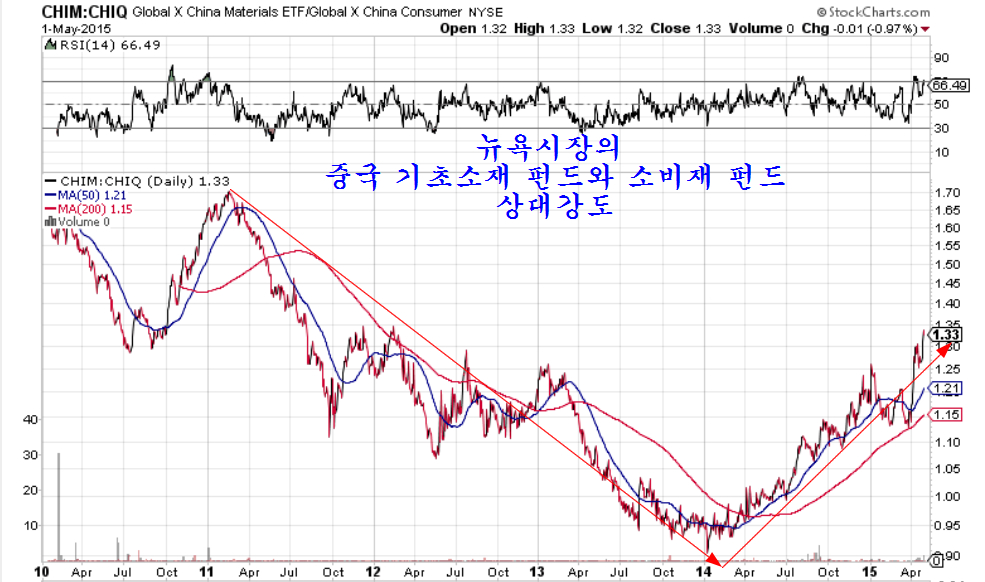 한편, 미국의 투자자들은 중국의 경기 민감주 매수에 적극적이다. 경기에 민감한 기초소재 업종 펀드를 경기를 덜 타는 소비재 업종 펀드로 나눈 상대 강도를 보면 이런 변화를 읽기 쉽다. 2011년 이후 2014년말까지 상대강도가 가파르게 추락함으로써 중국의 기초소재 펀드가 하락하고, 소비재 펀드가 크게 오른 것을 나타냈지만, 2015년에 들어서면서 상대강도가 가파르고 견조한 상승세를 보이고 있어 중국 소비재 투자자 위축되고 중국 경기 민감주 투자가 진행되고 있음을 알 수 있다. 눈에 보이고 남들이 해야만 뒤따르는 중국인이나 한국인에 앞서 글로벌 펀드가 먼저 방향을 바꾸고 있다.