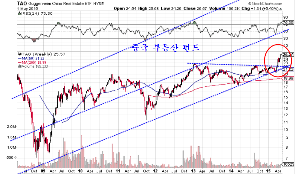 뉴욕시장에서 거래되는 중국 부동산 펀드인 TAO(직접 살 수 있음)는 3월말 중국의 금융규제 완화 이후 가파른 급등세이다. 5월 첫날 뉴욕시장 거래에서도 5.4% 급등세를 보이고 있다. 이것은 중국의 부동산과 건설 경기가 회복된다고 확신한 미국의 투자자들이 경기에 앞서 중국 부동산 펀드를 집중 매수하고 있는 모습이라 할 수 있다.