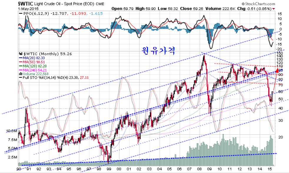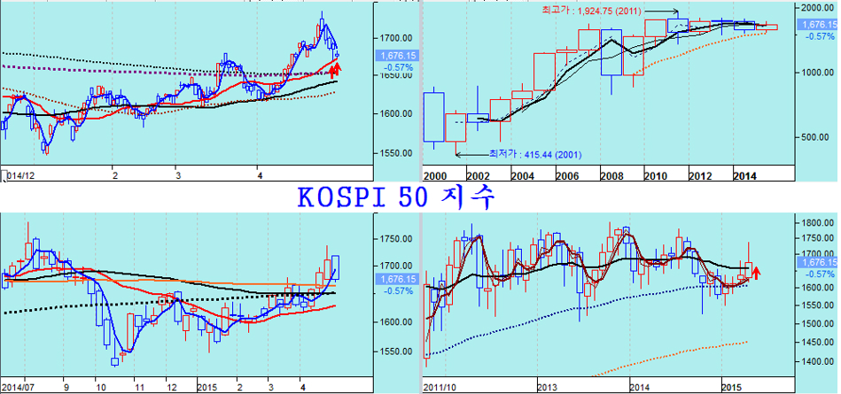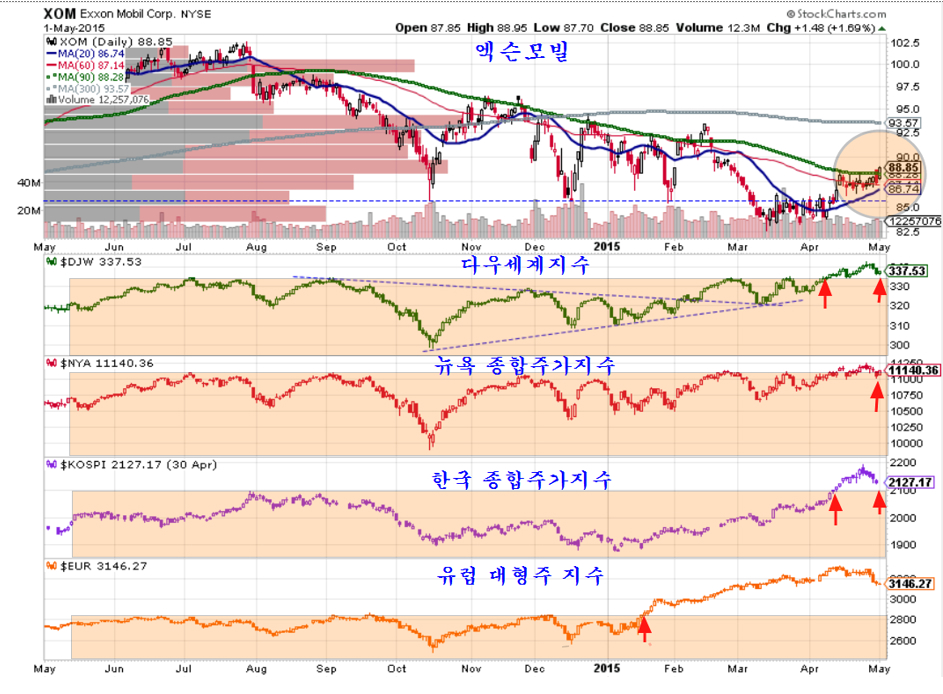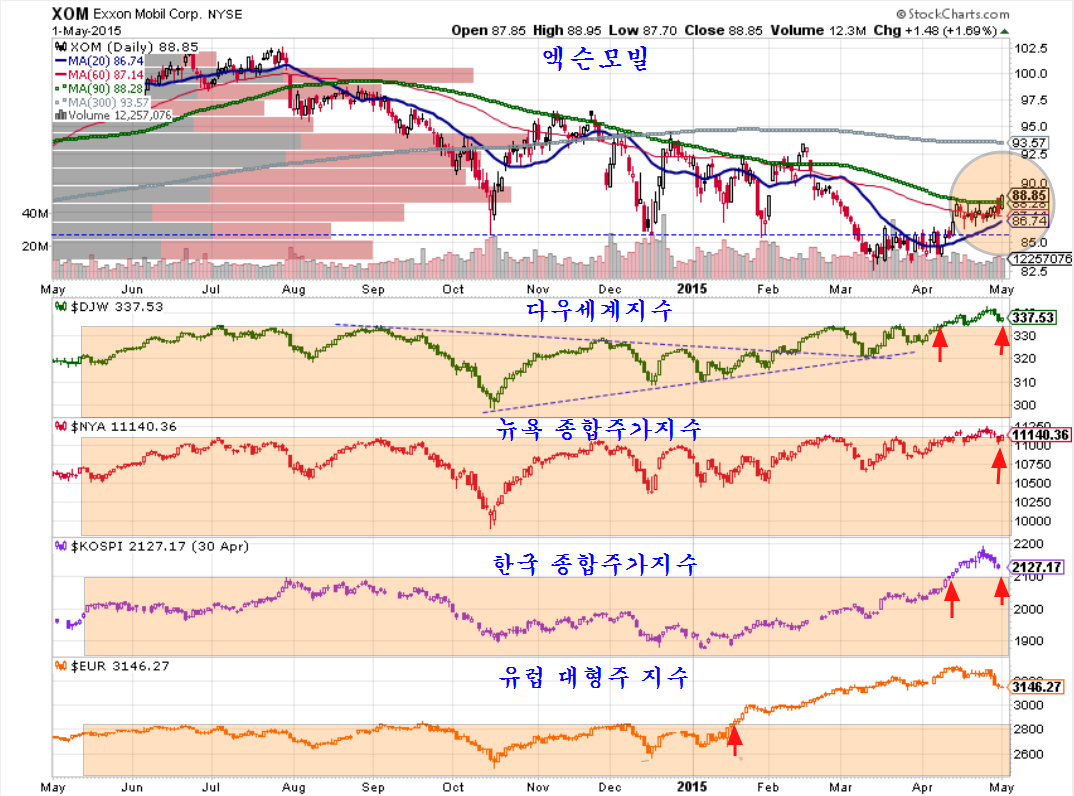 그간 엑슨모빌이 지루한 정체를 보이면서 세계 증시의 상승을 늦춰왔는데, 지금은 다우세계지수는 물론 한국 종합주가지수 등 주요 지수게 지지권에 접해 있는 모습이다. 이 엑슨모빌은 주로 한국의 옵션 시장과 여타 파생상품 시장을 겨냥하여 마치 조커처럼 이용하는 주가이다. 이 엑슨모빌이 장기 저항이 되었던 90일 평균(5월 평균)을 넘어 상승이 시작되고 있다는 점에서 그간의 지루한 정체를 벗어나 세계 증시를 상승으로 이끌지가 주목된다.