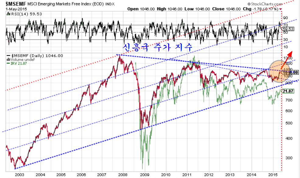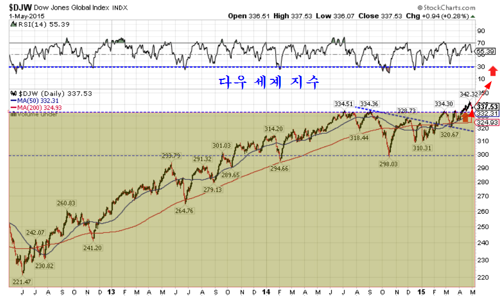 엑슨모빌을 이용하여 지루한 등락을 만들던 세계 증시가 다시 상승할 조건이 되었다. 다우 세계 지수가 돌파된 지지권에 근접함으로써 본격적인 상승 국면이 가깝다.