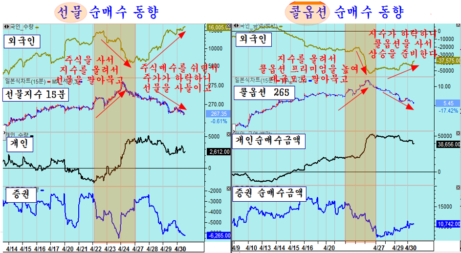 4월 23일 이후 지수 고점으로 생각하는 내국인이 주식 매도를 늘림에 따라, 매도 물량을 쉽게 살 수 있는 기회를 이용하여 대규모로 현물을 사서 지수를 더 급히 올린 후, 주식매수와 병행하여 선물 매도와 콜옵션 매도로 단기 조정을 대비해 두는 전략을 구사한다.