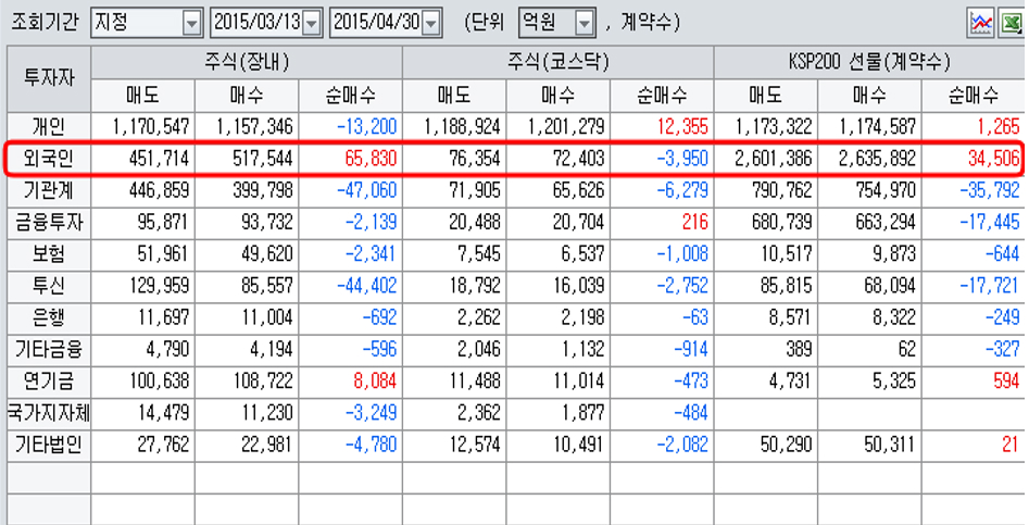 3월 선물 만기가 끝나고 6월물 거래가 시작된 3월 13일 이후 외국인은 6조 5000억원이 넘는 주식을 사들였고, 내국인은 연기금 8000억원 매수를 제외하면 모두 매도 일변도이다. 더욱이 선물에서도 외국인은 3만, 4000계약이 넘는 물량을 사들여 주식과 선물 시장의 싹쓸이 하다 시피 주식을 사고 있다.