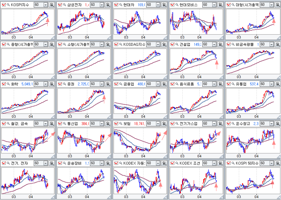 60일 평균을 이탈해 있는 전기전자 자동차 역시 저가 매수 조건이지만 지수를 움직이는 조커에 해당하는 업종이므로 만기까지는 다소 정체할 가능성이 있다. 여타 증권과 화학 등 그간 상승을 선도해 온 업종들은 20일 평균을 지지로 한 상승을 주목할 때다.