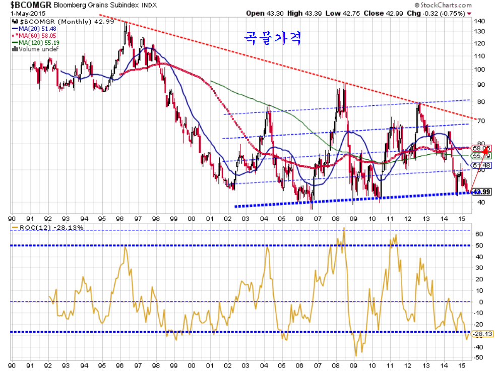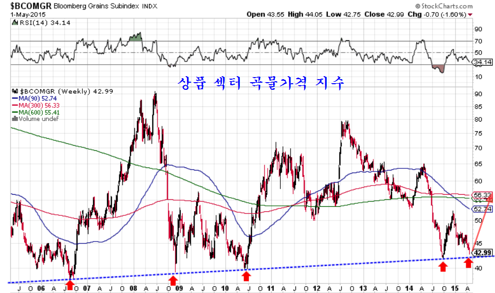 곡물가격은 하락이 이어졌지만, 대세의 지지권으로 반전이 기대되는 위치이다.