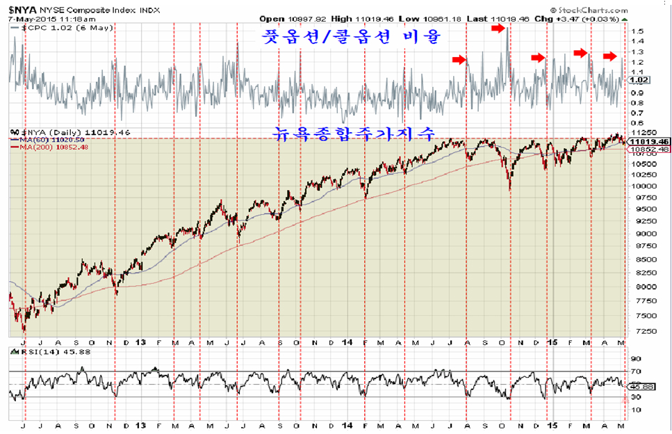 이번 주 급락과 함께 우리 시장의 하락 모멘텀처럼 보였던 미국 증시 역시 옵션시장이 과열된 모습이다. 뉴욕시장에는 옵션시장의 치우침을 나타내는 지표로 풋옵션 포지션을 콜옵 포지션으로 나눈 풋옵션/콜옵션 비율이 있어 옵션 시장의 과열을 알기 쉽다.