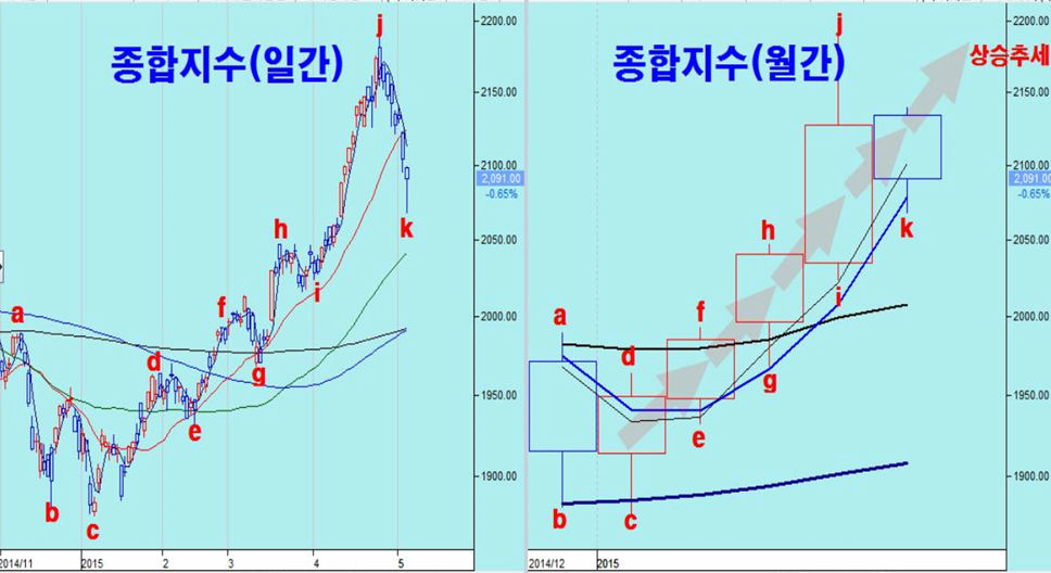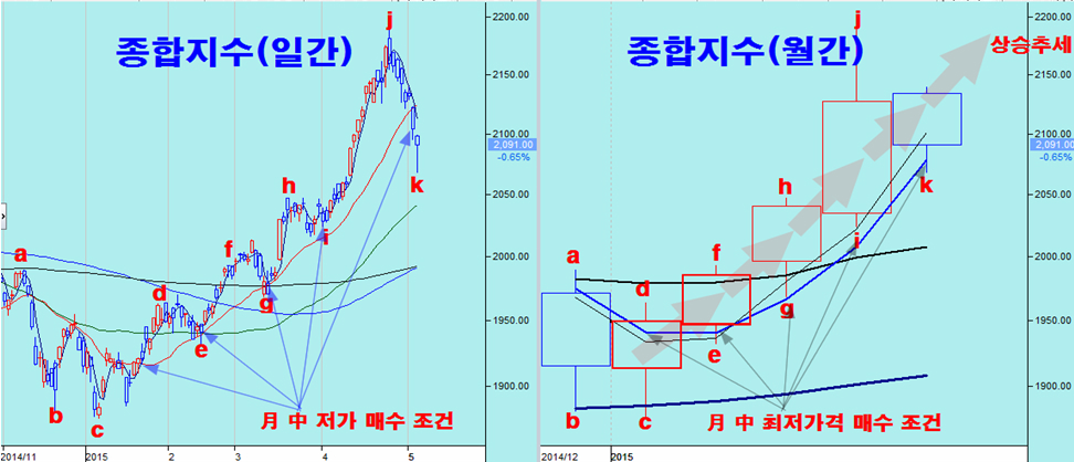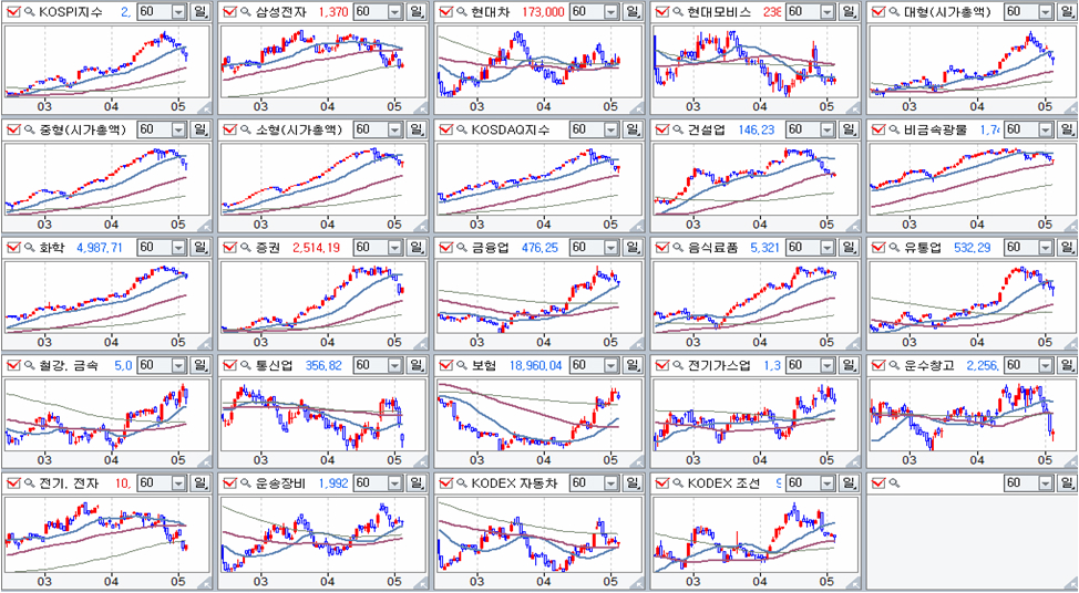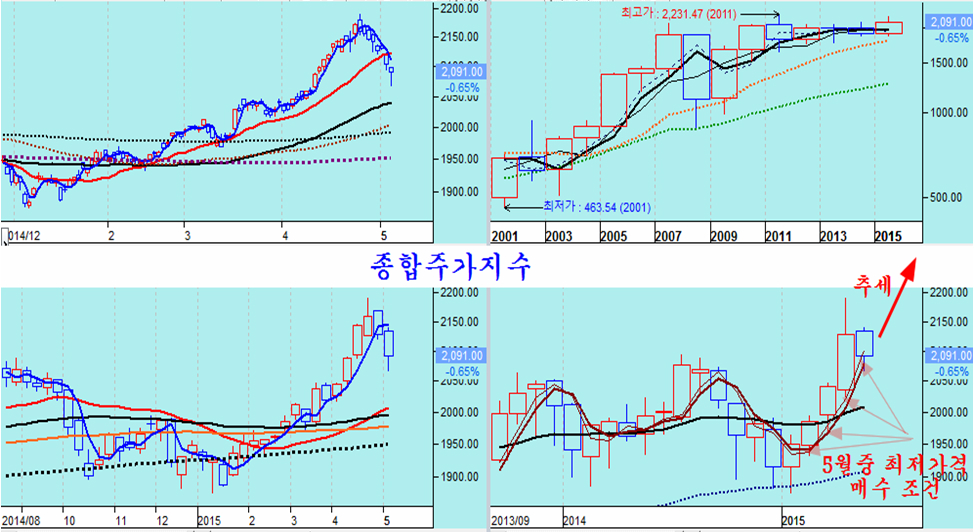 그러나, 거래소 시장과 코스닥 시장 모두 4월 급등에 따른 이격 부담이 하락과 함께 해소되었으므로 지수와 상관없이 상승으로 움직이는 장세가 될 수 있다. 종합주가지수와 함께 대부분의 업종지수가 60일 평균 근처까지 하락해 있다. 월봉으로는 월중 최저가 매수 기준인 시가3선 가격에 있어서 월중 매수에 좋은 기회이다. 특히 60일 평균까지 하락이 나타난 건설, 증권, 조선, 운수, 코스닥 등 자동차, 전기전자가 모두 적극 매수권이다.