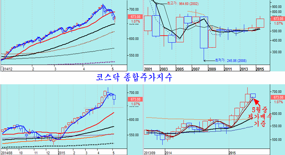 7일 오전 주가가 급락하면서 거래소 종합주가지수나, 코스닥 종합지수 모두 월중 저가 매수 기준인 시가3선을 아래로 밀렸으며 이후 반등과 함께 하락폭을 좁혀 마감하였다. 거래소나 코스닥 모두 5월중 가장 싼 가격에 살 수 있는 가격 기준을 만족하고 있다.