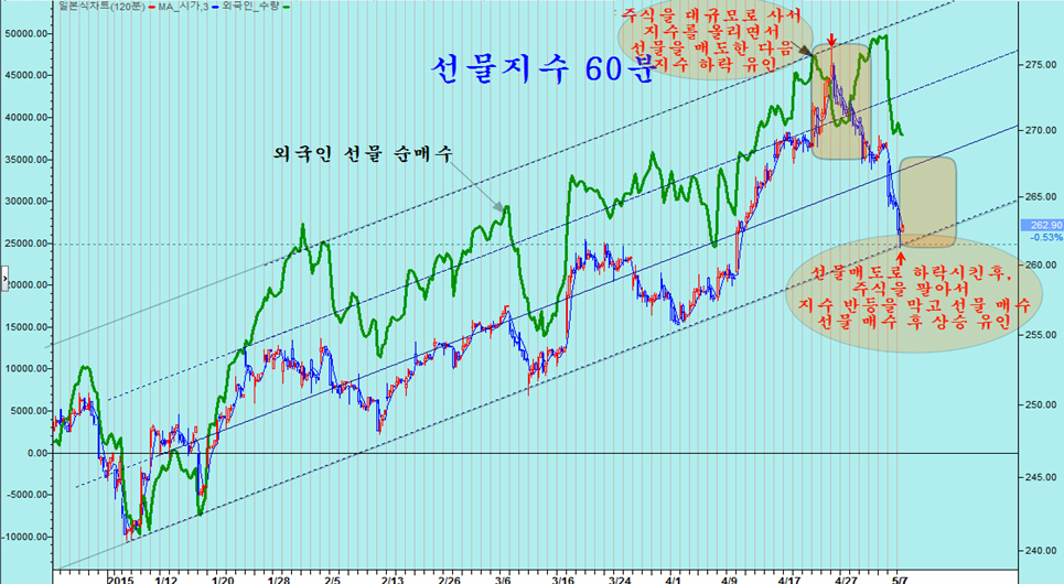 4월 20일 경 주가가 채널 상단에 접하면서 단기 고점으로 인식한 일반이 매도 물량은 많이 내지만, 외국인은 하루 5000억원이 넘는 주식 대량 매수를 통해 오히려 지수를 끌어 올림으로써 높은 프리미엄에 선물과 콜옵션을 파는 변화를 주고 있고, 5월 6일 지수가 20일 평균에서 지지될 것이라는 기대감이 큰 곳에서는 선물 11,000계약의 대규모 매도로 프로그램 매도를 유인하여 지수를 아래로 크게 끌어내리는 변화를 주고 있다.
