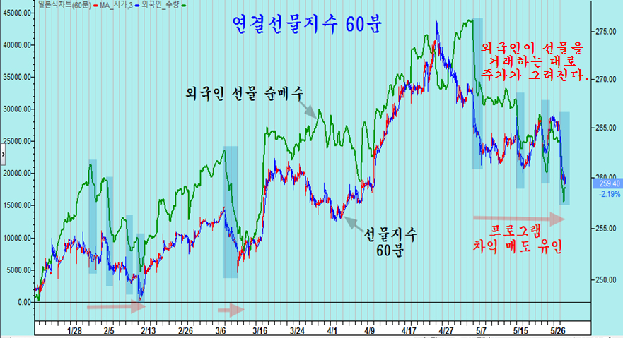 한편, 선물과 현물의 가격차이인 베이시스를 보면, 4월 중순까지 베이시스 1.0 이상에서 유지되면서 프로그램 매수 조건이 유지되었으나, 4월 하순 이후 베이시스가 좁혀지면서 프로그램 매도의 조건이 성립되었고, 5월 이후에는 베이시스가 마이너스 상태가 되는 프로그램 매도 조건이 되어 외국인은 이를 이용하여 적극적으로 하락을 유인했다고 볼 수 있다.