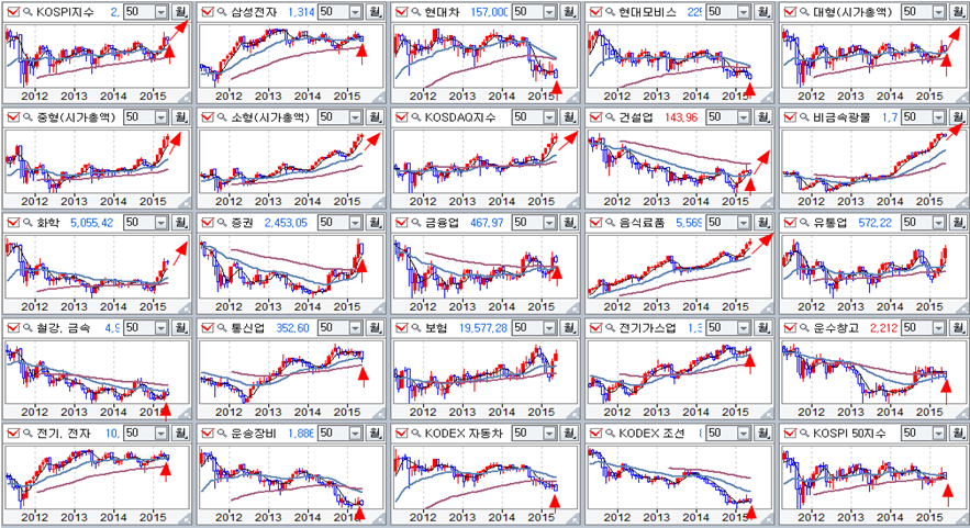 변동의 관점이 아닌 추세를 보는 월봉의 흐름은 상승 추세 중 눌림목 조정의 상태를 나타내며, 기업의 실적 변화를 반영하는 20월 평균을 넘어선 건설, 은행, 철강, 해운, KOSPI 50 지수가 바닥을 벗어나 대세 상승으로 진입하는 변화점을 나타내고, 중형, 소형, 코스닥, 비금속광물과 화학, 증권, 음식료,. 유통업 등은 견실한 상승 추세 중임을 나타낸다.