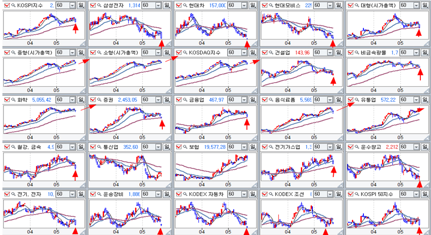 다음은 주요 업종의 일봉 주가로 20일평균과 60일 평균이 함께 그려져 있다. 업종 대표주가 시가총액이 크고 강한 종목은 60일 평균 또는 그 이하의 저가권을 형성하고 있고, 소형주처럼 프로그램 영향을 덜 받거나 상승세가 강한 업종은 20일 평균에서 눌림목을 형성하고있다.
