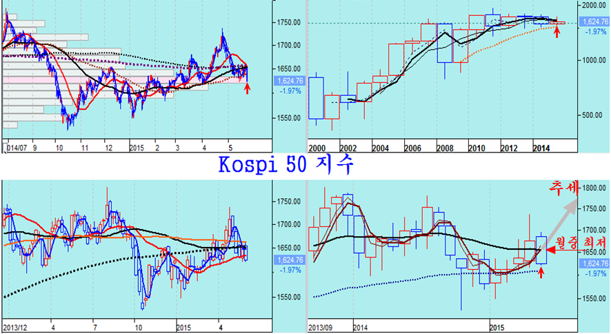 일봉으로는 주가 하락이 매우 큰 것 갖지만, 장기로 진행하는 추세 흐름에서는 잡음 변동에 불과하다. 하락이 나타날 때마다 그리스, 경기, 금리인상 등 이런 저런 구실을 가져다 붙이지만 실상 주가는 외국인의 마음대로 움직이며 이런 재료는 그저 하락을 편하게 이해하고 싶은 설명일 뿐이다.