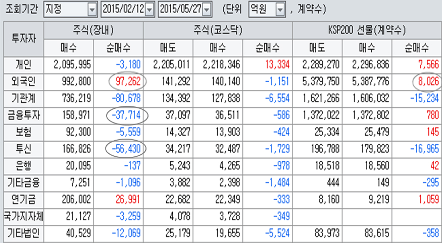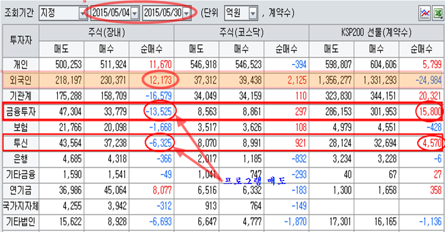 5월 4일 이후 선물을 매도하며 프로그램 차익거래의 매도를 유인해 온 외국인은 5월 들어 네번째로 대규모 선물 매도로 프로그램 매물을 이끌며 큰 폭 하락을 이끌었으나 오늘 4300억원의 증권사 프로그램 매물과 외국인의 지수 압박용 1800억의 매물이 이어져 프로그램 매물 처리 과정이 일단락 되는 듯 하다.