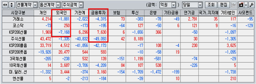 여하튼, 2월 12일 옵션 만기 이후 외국인은 선물을 사고 파는 가운데 선물과 옵션에서 이익을 취하는 한편으로 9조 7000억원의 주식을 쓸어담아 장차 상승 국면에 대한 준비를 해 두고 있다.