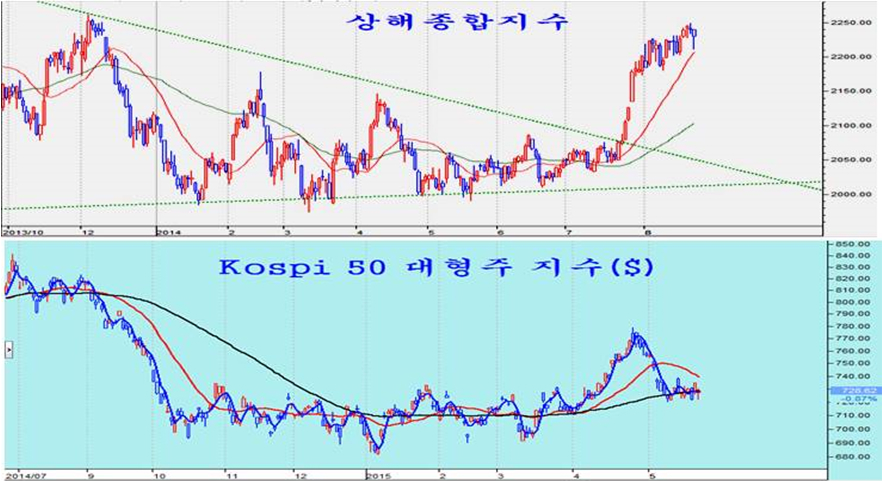 상해 종합주가지수가 상승이 시작되기 전, 2013년 12월부터 1월 중순까지 급락을 거쳐 6개월간 어떤 모멘텀도 작용하지 않는 지루한 정체 과정이 이어진 후 상승이 시작되었는데, 이 모습은 달러로 환산해서 보는 Kospi 50 지수의 모습과 흡사하다. 지난해 9월 이후 10월 중순까지 급락을 거친 kospi 50 지수는 6개월이 넘는 기간 중국 상해종합지수보다 더 지루한 조정이 이어지고 있다. 이러한 시련이 중국과 같은 급등을 위한 필요 조건이라면 kospi 50 지수는 이미 이 조건을 갖춘 것이라 하겠다.