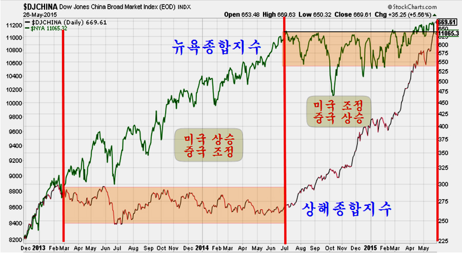 한편, 세계 증시와 중국 증시를 비교하는 경우 중국과 미국 또는 중국과 세계증시가 서로 상보적인 움직임을 보여왔다. 2013년 초까지 중국 증시는 세계 증시의 흐름을 어느 정도 뒤따라 움직였지만, 2013년 초부터 미국증시가 상승할 때 중국증시는 지루한 조정을 거쳤고, 2014년 7월부터 이 관계가 역전되어 중국 증시가 가파른 상승을 하는 가운데 미국을 비롯한 선진국 주가와