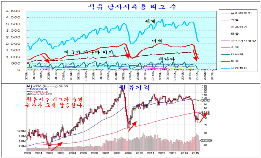 다음은 과거 원유 시추 리그 감소에 따른 유가 변화를 나타낸 것이다. 이 관계를 살피면 향후 원유 가격의 장기적인 추이와, 엑슨모빌의 주가, 그리고 상품지수와 인플레, 상품지수에 반대로 움직이는 달러가치와 인플레에 반대로 움직이는 채권가격까지를 유추해 볼 수 있다.