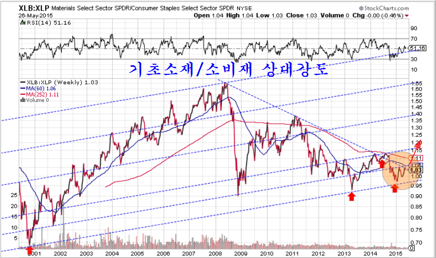더구나 기초소재와 관련된 엑슨모빌의 장기 추세 전환은 그간 경기 방어주인 소비재 업종에 비해 상대적으로 하락을 이어 온 경기 민감주의 7년 저항돌파와 함께 상승을 예고한다.